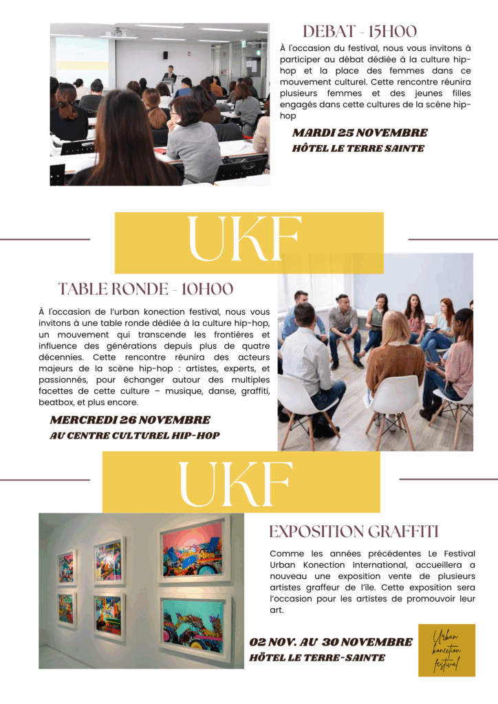 L’Urban Konection Festival International, une semaine dédiée à la culture hip-hop. En étroite collaboration avec des associations et les collectivités locales, cette édition spéciale mettra à l’honneur la diversité et la vitalité du hip-hop.